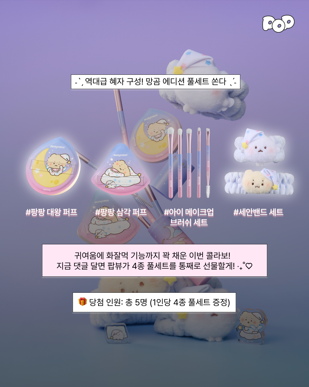 ※팡팡 대왕 퍼프, 팡팡 삼각 펌프, 아이 메이크업 브러쉬 세트, 세안밴드 세트 4종 풀세트 증정입니다.